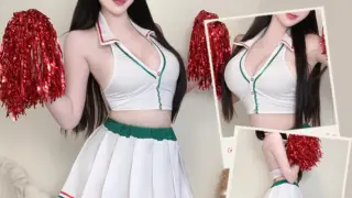 この衣装はチアリーダーをイメージしたコスチュームで、深いVネックと小ぶりな襟が目を引くホルターネックのクロップドトップと、ウエストゴムでふんわり広がる短めのプリーツスカートがセットになっています。トップは胸元をタイトに見せるフィット感とゴールドのボタン飾り、襟とラインの配色がアクセントになっており、...
