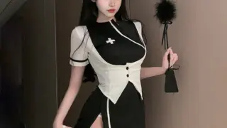 この衣装は黒と白のナースコスプレです。ミニ丈のボディコンワンピースで、胸元は深いVカットになり、白いX字ストラップと太めのハーネス状ストラップがバストを囲んでいます。肩まわりはパフスリーブで程よく覆われ、襟付きのチョーカー風デザインと小さなナース帽が付属しています。前面には小さな白いエプロンが付き、...