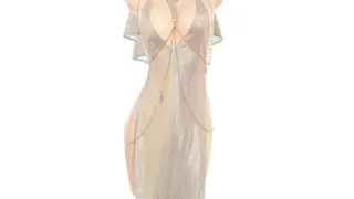 AliExpress 光沢メタリックのチェーンホルダードレス — ヴェール付き 光沢のあるメタリック生地を用いたホルターネックのロングドレスです。前面は深いVカットでバストラインを強調するホールド構造になり、両サイドは大胆なカットアウトで腰〜ヒップを露出させる設計です 2025.10.18 AliExpressホルターネック