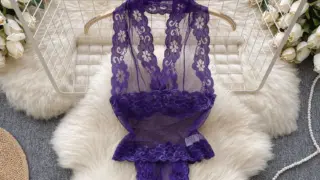 AliExpress 透け感で魅せる深Vレーステディ — リボンで結ぶバックレス 繊細な花柄レースを全面に使ったホールターネックのテディです。胸元は大胆な深Vカットで、両サイドの縦切り替えがバストを寄せるように見せる設計になっています 2025.10.14 AliExpressボディスーツ