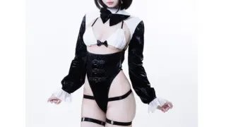 AliExpress 黒と白のコントラストが印象的なメイド風コスプレ衣装 この衣装は、黒と白のコントラストが特徴的なメイド風のコスプレ衣装である。前面には、白いレースのブラトップと、黒いベルベットの長袖ジャケットが組み合わさっており、襟元には黒いリボンが付いている 2025.11.10 AliExpressメイドメインモチーフ:メイド動物系