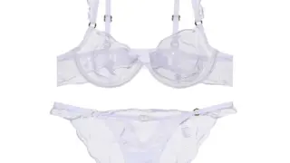この衣装は透け感を生かしたランジェリーセットで、この衣装はアンダーワイヤー入りのブラとローライズのTバックショーツがセットになっています。ブラは薄手のシアーメッシュに放射状の刺繍ラインが施されたカップで、縁はスカラップ状にカットされて波打つようなシルエットを描きます。ストラップはフリル風の飾りを持ち...