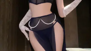 この衣装は大人のランジェリーをベースにしたコスチュームで、透け感のあるシアー素材と構築的なカップラインが特徴です。長めのロングスリットスカートとハイウエストのショーツが脚線を強調し、腰周りにはパールチェーンがドレープされ華やかさを添えます。細いストラップとカップ中央の小さなリボン、ボーン入りの縫い目...