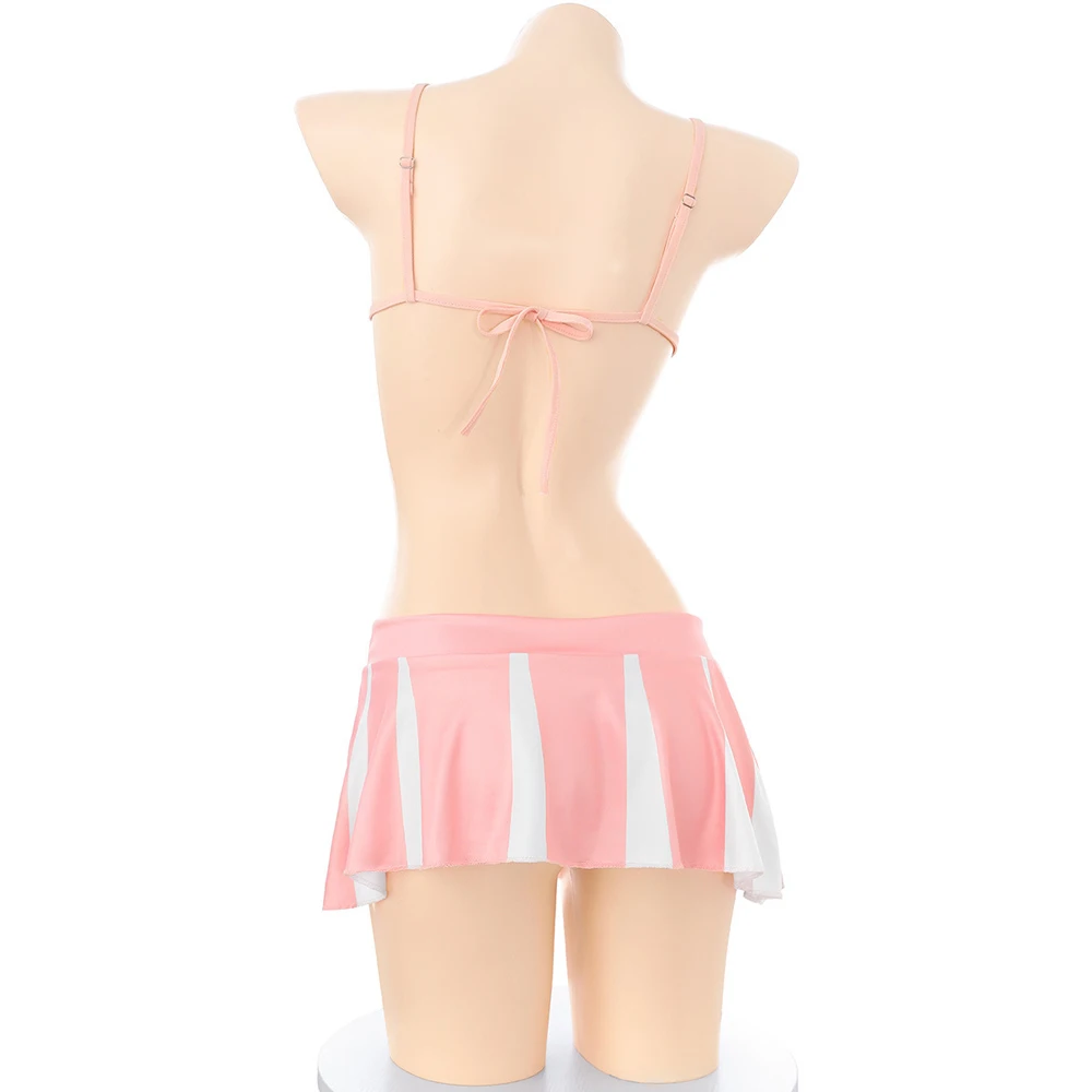 胸元に大きく「CHEER」のロゴを配したブラトップと、縦に白の切り替えパネルが入ったプリーツ風ミニスカートの2点セットです。ブラトップは細いアジャスター付きストラップと背面で結ぶ紐仕様で、前面は胸を覆うハイカット寄りのカットライン。裾に向かって軽く広がるミニ丈スカートは幅広のウエストバンドで安定感を持たせ、縦の切り替えがフレア感と視覚的な動きを生み出します。表面は光沢を抑えたスムースな合成繊維で、伸縮性のあるストレッチ感があり体に沿いやすい仕立てです。ロゴはプリント表現、ストラップにアジャスター、背面の紐で着脱とサイズ微調整ができる実用的な作りになっています。