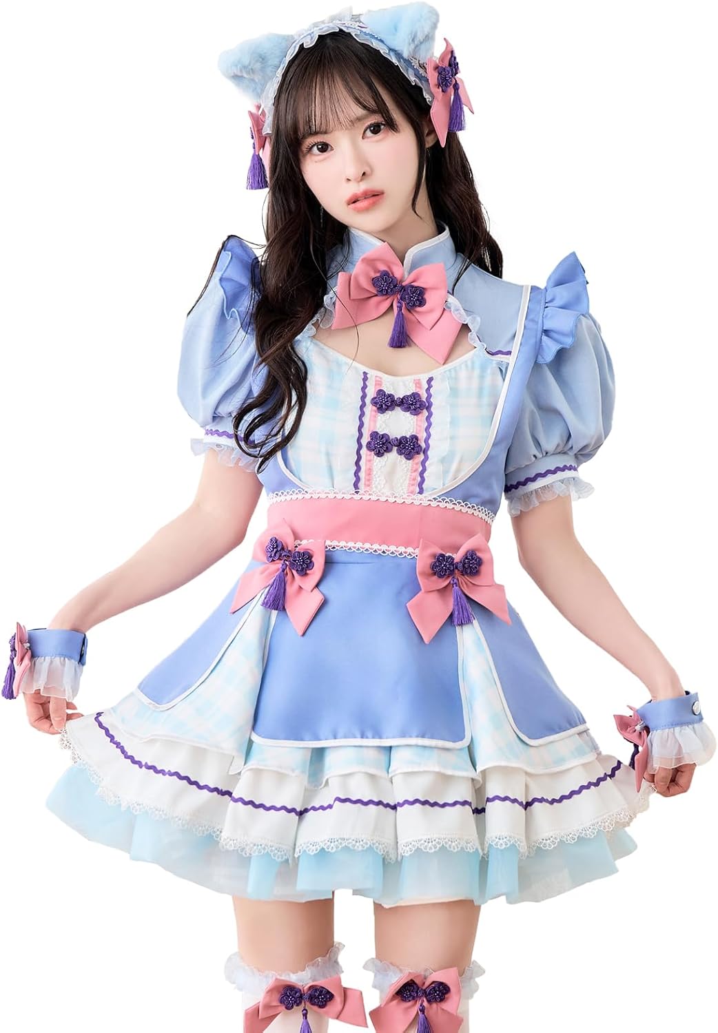- 商品名: [Malymoon] コスプレ アニマル 動物 キャット チャイナ 和装 フリル チェック 青 ねこ 衣装 仮装 マリームーン 10点セット 10272