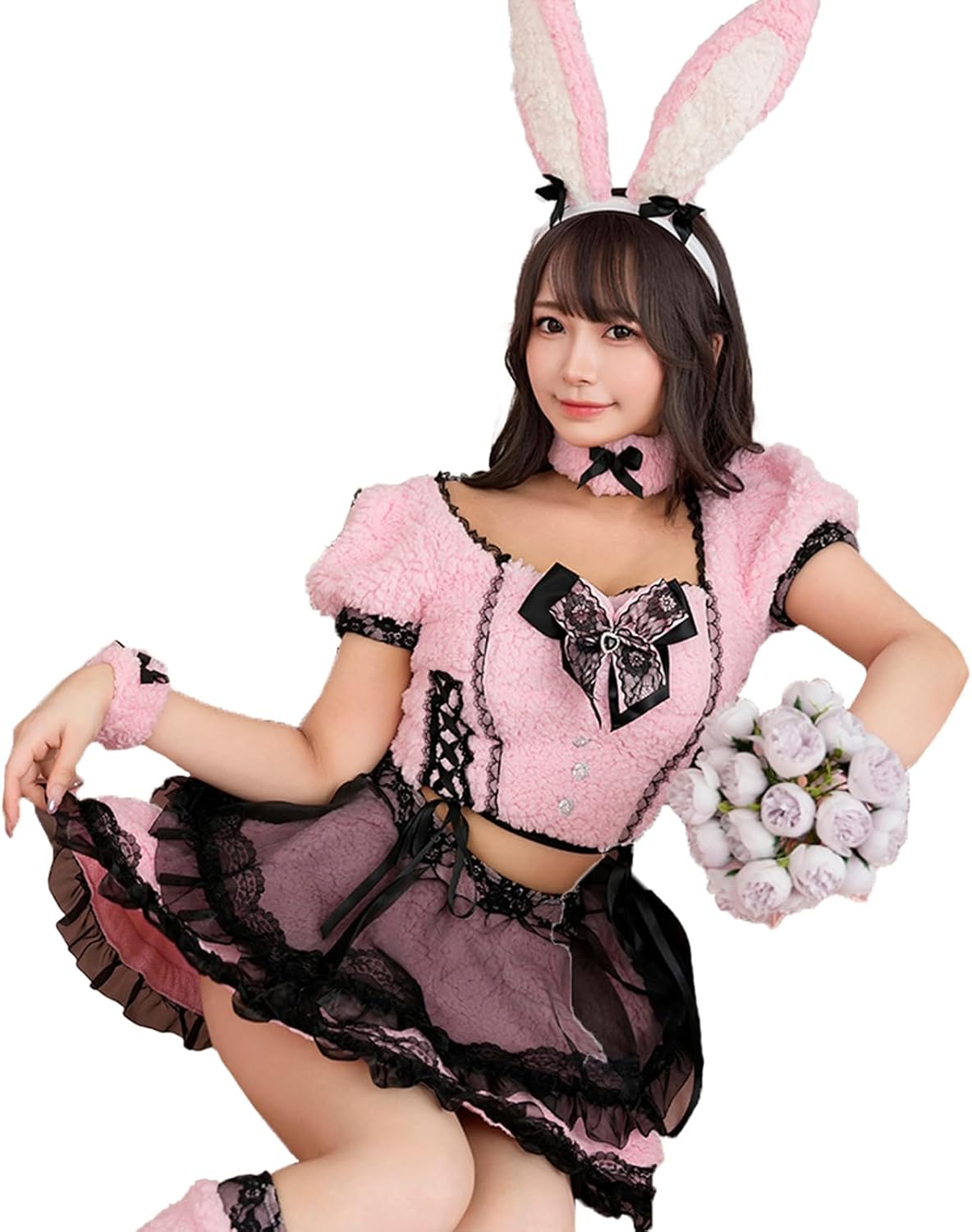 Malymoon(マリームーン)オリジナル 大人気コンカフェ【舞々悪魔】コラボ!ピンクのもこもこ感が小悪魔可愛いキャット&バニーコスチューム。 ハロウィンコスプレ6点セット。