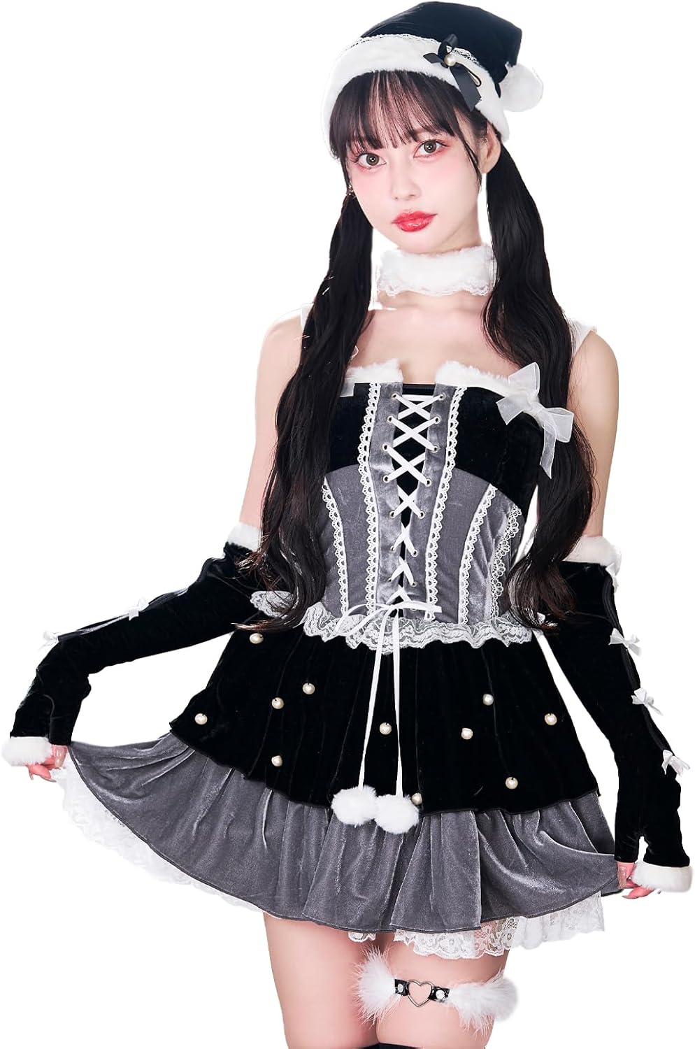• Malymoon(マリームーン)オリジナル ボリューミーで女の子らしいシルエットが可愛いレースアップサンタ。クリスマスコスプレ6点セット。