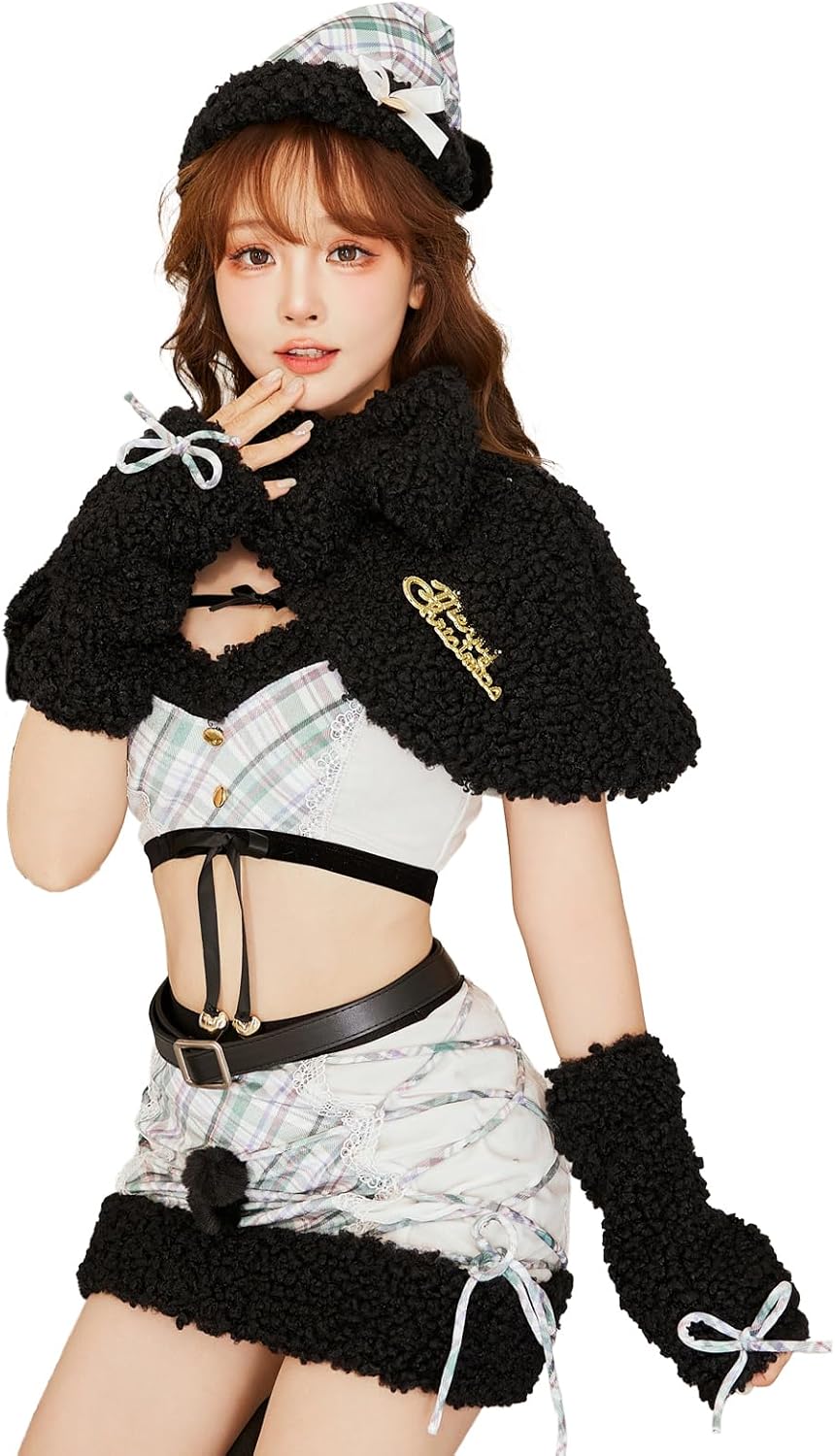 • Malymoon(マリームーン)オリジナル もこもこケープにチェック柄がキュートなサンタコスチューム。 クリスマスコスプレ8点セット。