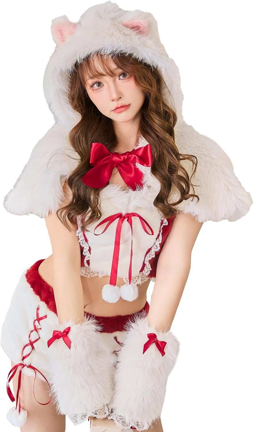 [Malymoon] コスプレ サンタ サンタクロース クリスマス アニマル 動物 キャット 猫 ネコ耳 レッド ホワイト 白 赤 衣装 仮装 マリームーン 7点セット 10032-3