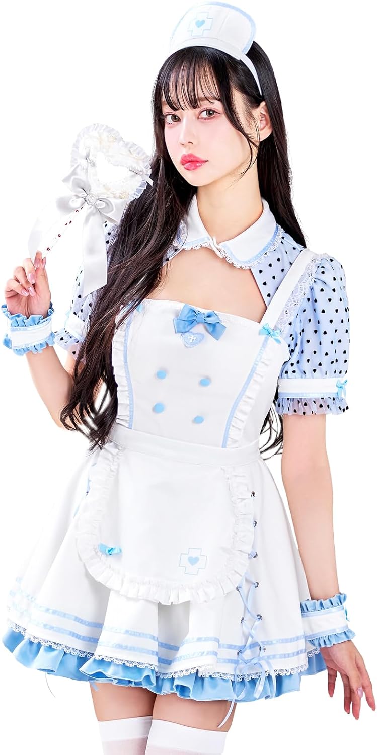 [Malymoon] コスプレ ホワイトデー ナース 看護師 ドット ホワイト ブルー 白 青 フリル 衣装 仮装 マリームーン 6点セット 10209-2