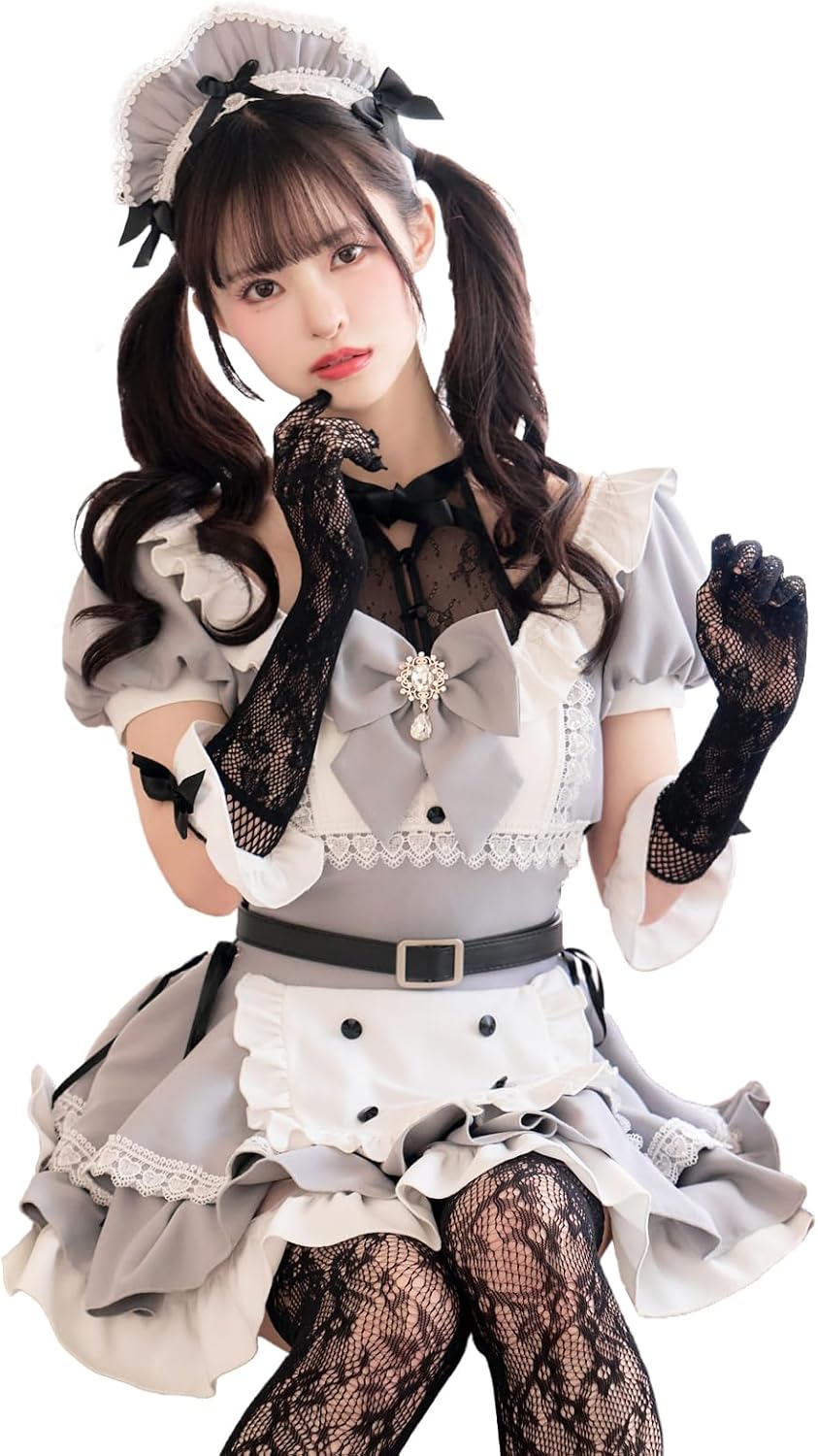 • 商品名: [Malymoon] コスプレ メイド ウエイトレス 家政婦 リボン レース ハート ブラック グレー 灰色 黒 衣装 仮装 マリームーン 8点セット 10223-2