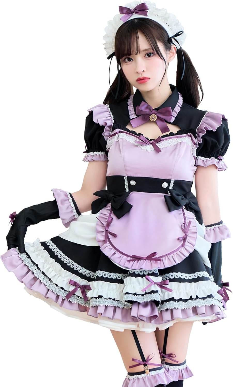 [Malymoon] コスプレ メイド ウエイトレス 家政婦 藤咲凪 黒 紫 メイド服 フリル リボン エプロン ワンピース 衣装 仮装 マリームーン 9点セット CS25033