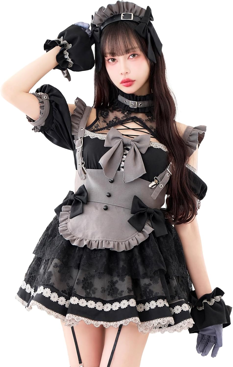 • [セット内容] ワンピースカチューシャフロントリボン手首飾り手袋エプロンバックリボンガーター首飾りニーハイソックス モデル着用のパニエは別売りです。
