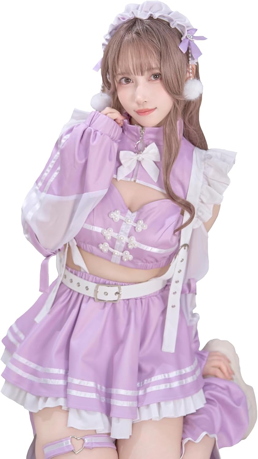 - [セット内容] ヘッドピースリボンヘアピン胸リボンインナー袖付きトップス腕ベルトウエストベルトスカート太もも飾りレッグウォーマー