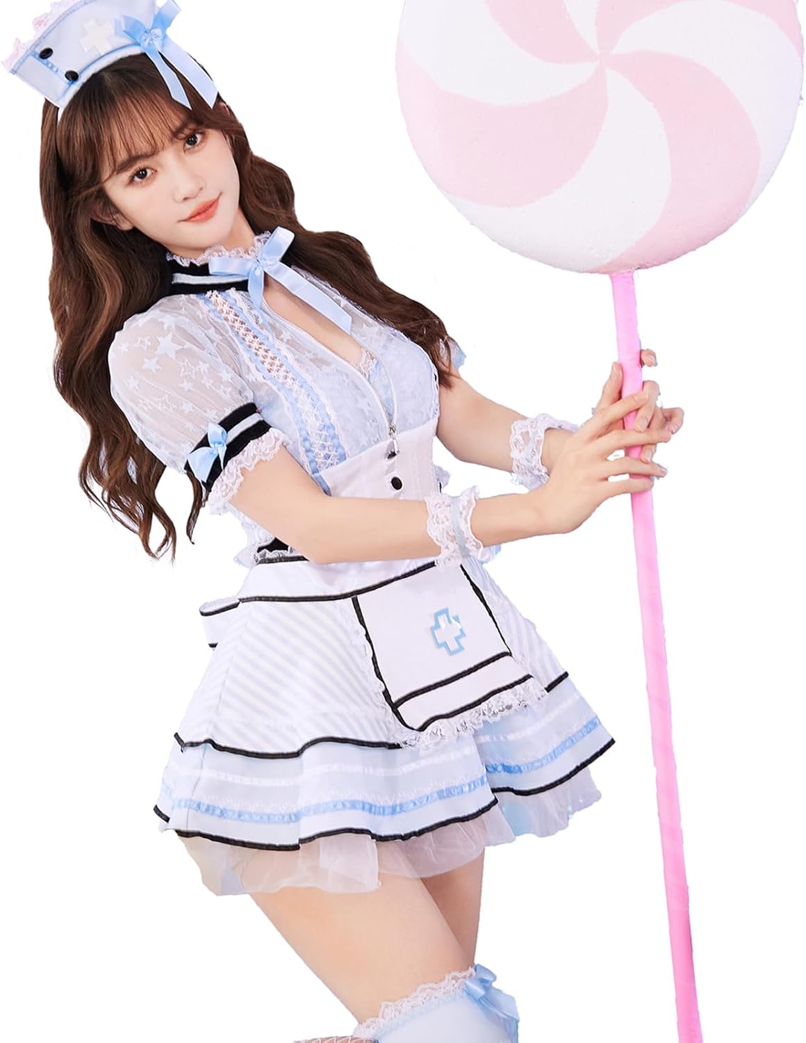 [Malymoon] ハロウィン コスプレ ナース コスチューム 水色 ストライプ 星柄 レース メイド服 衣装 ジッパー ナースメイド 7点セット 【s9542】 (ブルー)