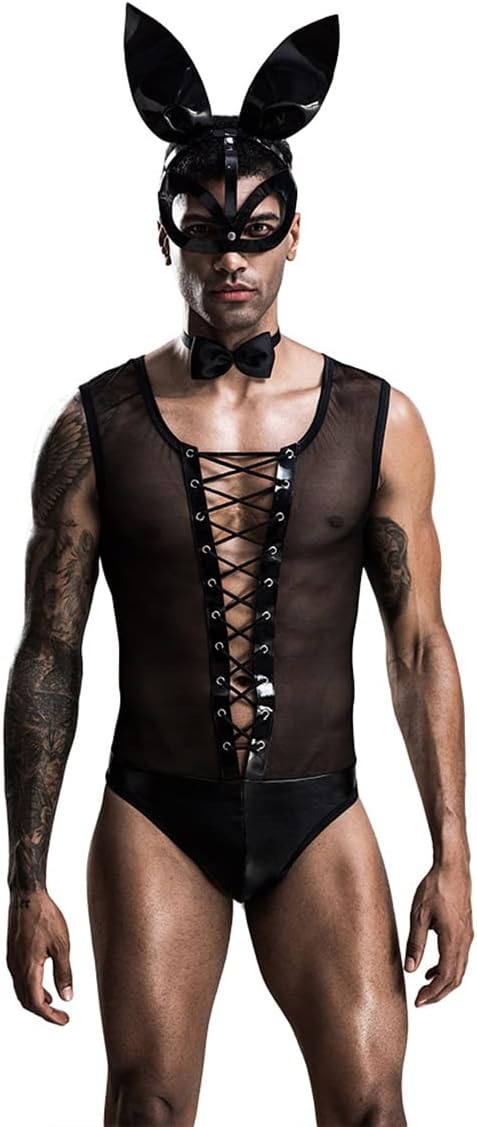 NACZHLOVELL コスプレ メンズ バニーボーイ5点セットセクシー ランジェリー 連体服 男性 ナイトクラブバー 調整可能なブラック 下着 誘惑な コスチューム 人気 衣装 うさぎ耳 可愛い ハロウィン 仮装 撮影パーティー cosplay フリーサイズ (ブラック)