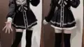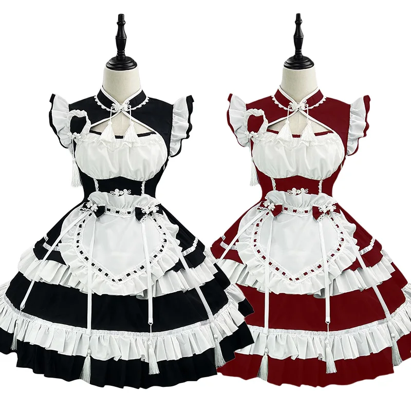 この衣装はクラシックなメイドをベースにロリータ的な要素を組み合わせた一着です。この衣装は膝下〜ミディ丈のふんわり広がるフレアスカートと段フリルでボリュームを出し、ウエストをしっかり絞るフィット&フレアのシルエットでメリハリを作っています。この衣装は肩先を覆うフリルのキャップスリーブと、チャイナ風の立ち襟に胸元の小さなカットアウトとタッセル紐を配したネックラインが特徴です。この衣装はマットな生地と光沢のあるエプロン風パーツを組み合わせ、縁取りのレース風トリムや小さなリボン、ハート形に見えるエプロンデザイン、垂れるタッセルで細部に華やかさを添えています。この衣装は取り外し可能なエプロンや袖カバー、ウエストリボンなどの付属で着せ替えやレイヤードがしやすく、コスプレイベント・撮影・メイドカフェ・テーマパーティーなど写真映えするシーンに適しています。