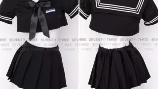 AliExpress クロップ丈セーラーセット — プリーツスカート×サテンリボン 見た範囲では、セーラーをモチーフにしたツーピースのコスチューム風セットです。上着は胸元で短く切ったクロップ丈で、背中に特徴的なセーラーフラップを持ち、襟周りに三本ラインのトリムが入っています 2025.10.23 AliExpress学生服