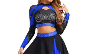 AliExpress 動き映えるチア2点セット:クロップトップ+フレアスカート(ラインストーン装飾) この商品はチア用の2点セットで、クロップトップとフレアスカートで構成されています。トップは長袖のフィットシルエットで、肩にシースルー切替と胸元のキーホールが入り、胴回りは幅のあるバンドで締める短め丈のデザインです 2025.10.22 AliExpressチア
