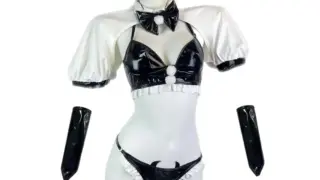 光沢のあるエナメル調素材とサテン風の白パーツを組み合わせた、バニーメイド風ランジェリーセットです。ブラは縫い目の入った三角カップで、前中心にポンポンを配しアンダーはリボンで結ぶ調整仕様になっています