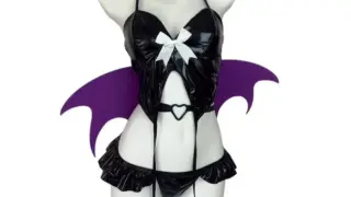AliExpress サキュバス風PVCハーネスセット — ウィング&フリル付きランジェリー 光沢のあるPVC(合皮)素材を主体にしたランジェリーセットです。成形されたカップはハルターネックで吊り上げる仕様、胸元には対照的なサテンリボンの大きなリボンがアクセントになっています 2025.10.22 AliExpressPVC