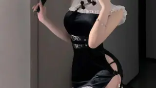 AliExpress ベロアの曲線を魅せるチャイナ風ミニドレス — サイドカット+ガーター 黒地のベロア調ミニドレスに白いサテン風のハイネックとフリルを組み合わせたチャイナ風ワンピースです。肩先は小さなフリルで覆われたノースリーブに近いデザイン、胸元は白いヨークと盤扣(チャイナボタン)で飾られ、中央に小さなスリットの抜けがあります 2025.10.23 AliExpressガータービスチェ