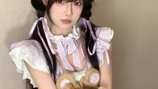 AliExpress 幼めガーリー×くまモチーフのラベンダーメイド風チェックワンピ 淡いラベンダーのギンガムチェックを基調にしたメイド風ワンピースです。小さめのチェック柄が全体に統一感を与え、白い二重のフリルが肩や襟元にふんわりと重なっています 2025.10.15 AliExpressメイド
