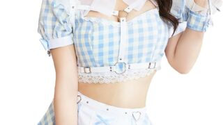 AliExpress ギンガムエプロン風ミニワンピ — 背中リボンで魅せる 白地に薄い水色ギンガムチェックを効かせたミニエプロン風コスチュームです。ホルターネックの深いVラインと胸元リボン、透け感のある白い伸縮素材が前面を覆い、ウエストはギンガムベルトで絞るデザイン 2025.10.14 AliExpressコスプレ