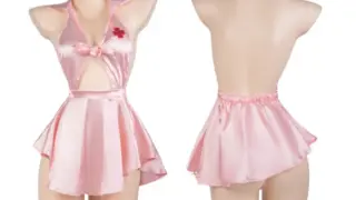 薄手のピンクサテンで仕立てられたナース風ランジェリーです。ハルターネックから胸元へ深く開いたVカットは、パッドやワイヤーの入らないソフトなカップラインで身体に沿う設計になっています