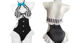 AliExpress ストライプフリルのバニーモノキニ — カットアウト&ボタン装飾 ハイネックのホルターネックと胸元のストライプカップが印象的なモノキニです。胸下にギャザーを寄せたフリルと小さなリボンを配し、下腹部はボタン付きのタック風パネルで引き締め効果を出しています 2025.10.18 AliExpressバニー