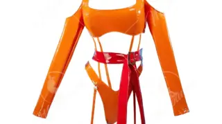 鮮やかな色遣いが目を引く、光沢の強いPVC(エナメル)素材で仕立てられたセットアップです。胸元はスクエアのカットアウトを入れたビスチェ風の構成で、アンダーバストを縁取るステッチが形を整えています