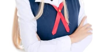 この衣装は、制服を想起させるデザインと、それらを凌駕する官能的な構造が交差する。ブラウスは肩から首元にかけての襟が特徴的で、紺色のリボンが大きく結ばれた水手服風のデザインである