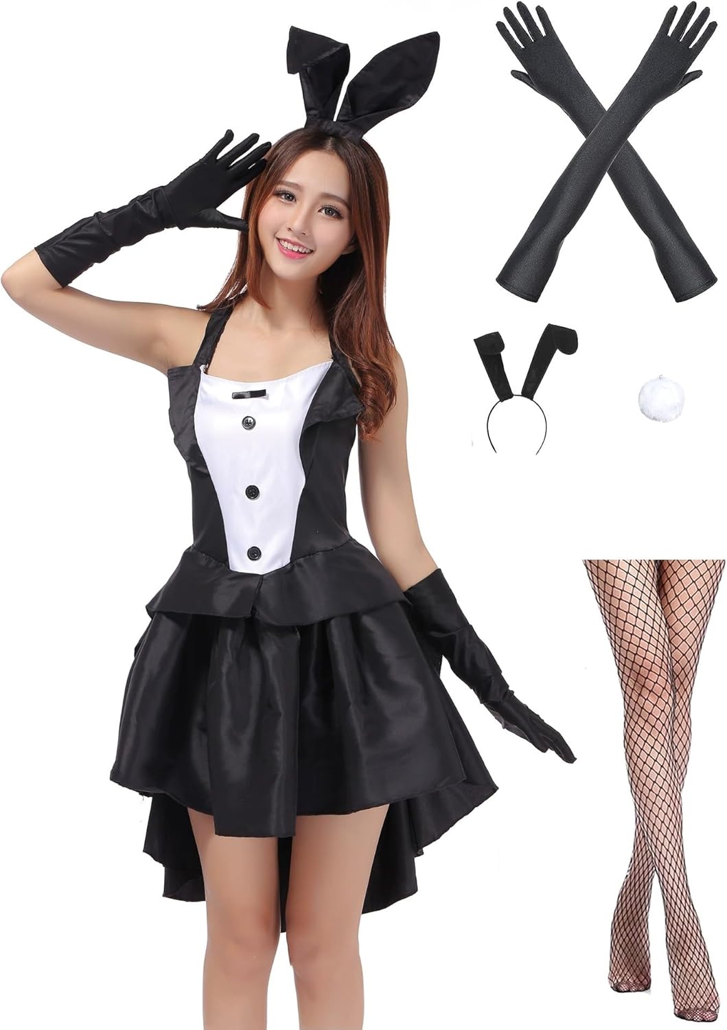 - ❥❥❥【5点お得なフルセット】: ①バニー衣装、②手袋、③うさ耳カチューシャ、④ワンポイントの丸い尻尾、⑤網タイツ、
